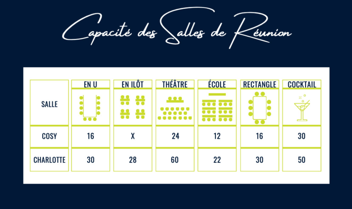 2 salles de réunion Cosy (20m²) et Charlotte (60m²), modulables et équipées